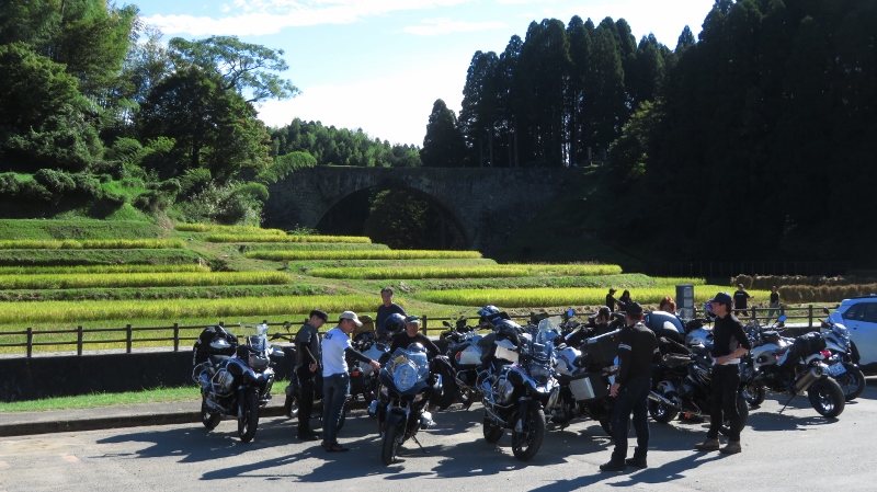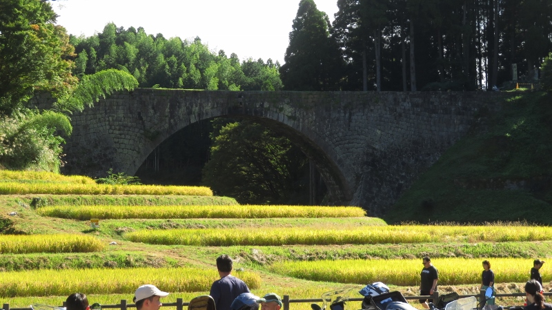 0930、稲刈りが半分程度終わっている通潤橋に着♪暑い!!29℃!!