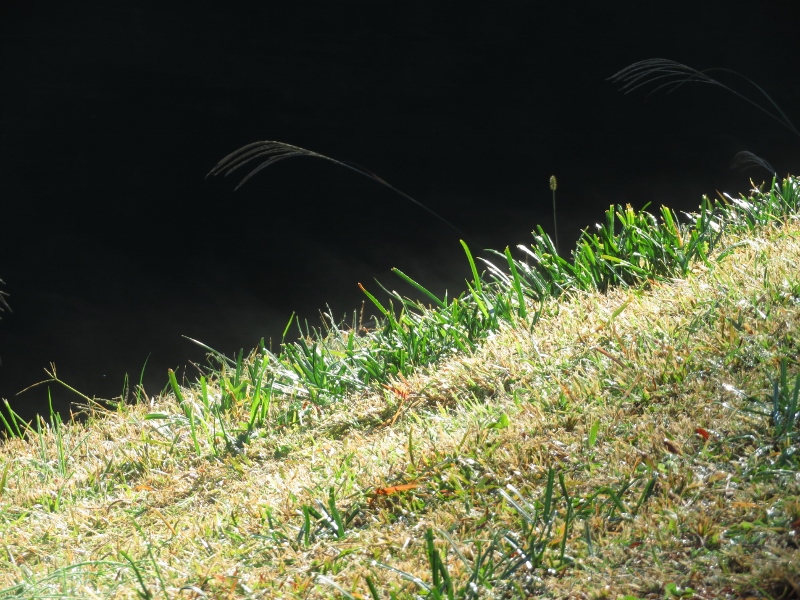 露がびっしりの土手からは朝日に照らされて湯気が。