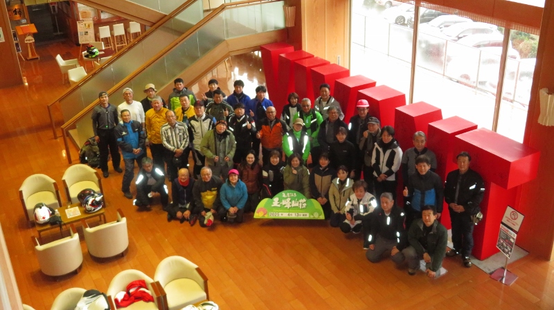 ▲本年4月開催・1泊ツー、2日目スタート前の亀嵩温泉玉峰山荘。雨天なんでロビーにて▲