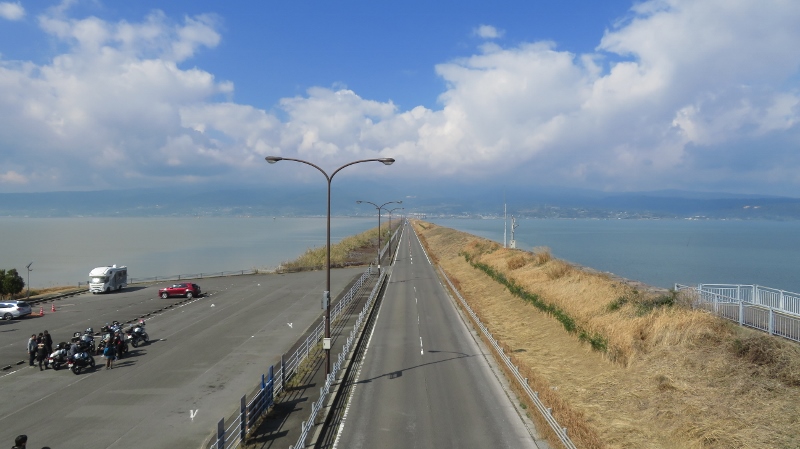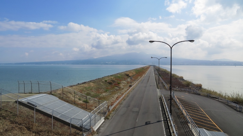▲向こうは雲仙岳。右は諫早干拓地内。左は有明海▲